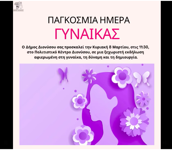 Με αφορμή την Παγκόσμια Ημέρα της Γυναίκας, ο Δήμος μας σας προσκαλεί σε μια ξεχωριστή εκδήλωση αφιερωμένη στη δύναμη, τη δημιουργικότητα και τη διαχρονική προσφορά της γυναίκας στην κοινωνία.