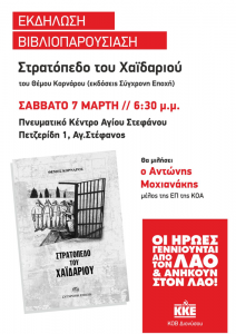 Το βιβλίο του Θέμου Κορνάρου “Το στρατόπεδο του Χαϊδαρίου” από τις εκδόσεις Σύγχρονη Εποχή, θα παρουσιαστεί το Σάββατο 7 Μαρτίου στο Πολιτιστικό Κέντρο Αγ. Στεφάνου στις 6.30 το βράδυ. Το βιβλίο θα παρουσιάσει ο Αντ. Μοχιανάκης, μέλος της Επιτροπής Πόλης της Κομματικής Οργάνωσης Αθήνας του ΚΚΕ, σε μια εκδήλωση με ιδιαίτερο ενδιαφέρον λόγω των τρεχουσών εξελίξεων σε παγκόσμιο επίπεδο.