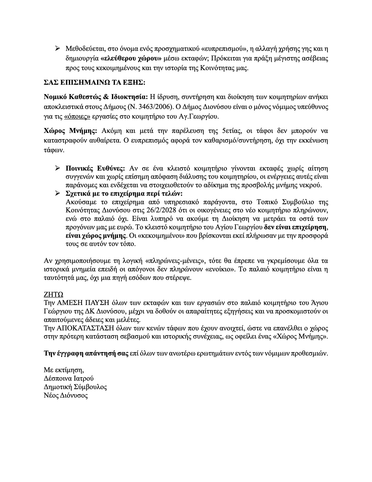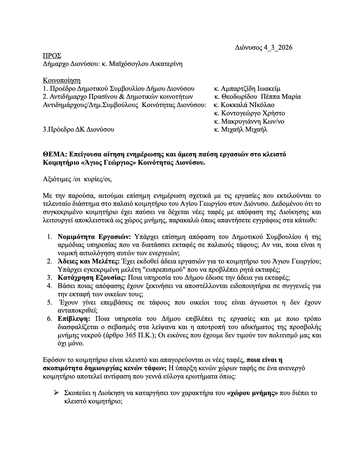 Με την παρούσα, αιτούμαι επίσημη ενημέρωση σχετικά με τις εργασίες που εκτελούνται το τελευταίο διάστημα στο παλαιό κοιμητήριο του Αγίου Γεωργίου στον Διόνυσο. Δεδομένου ότι το συγκεκριμένο κοιμητήριο έχει παύσει να δέχεται νέες ταφές με απόφαση της Διοίκησης και λειτουργεί αποκλειστικά ως χώρος μνήμης, παρακαλώ όπως απαντήσετε εγγράφως στα κάτωθι:
