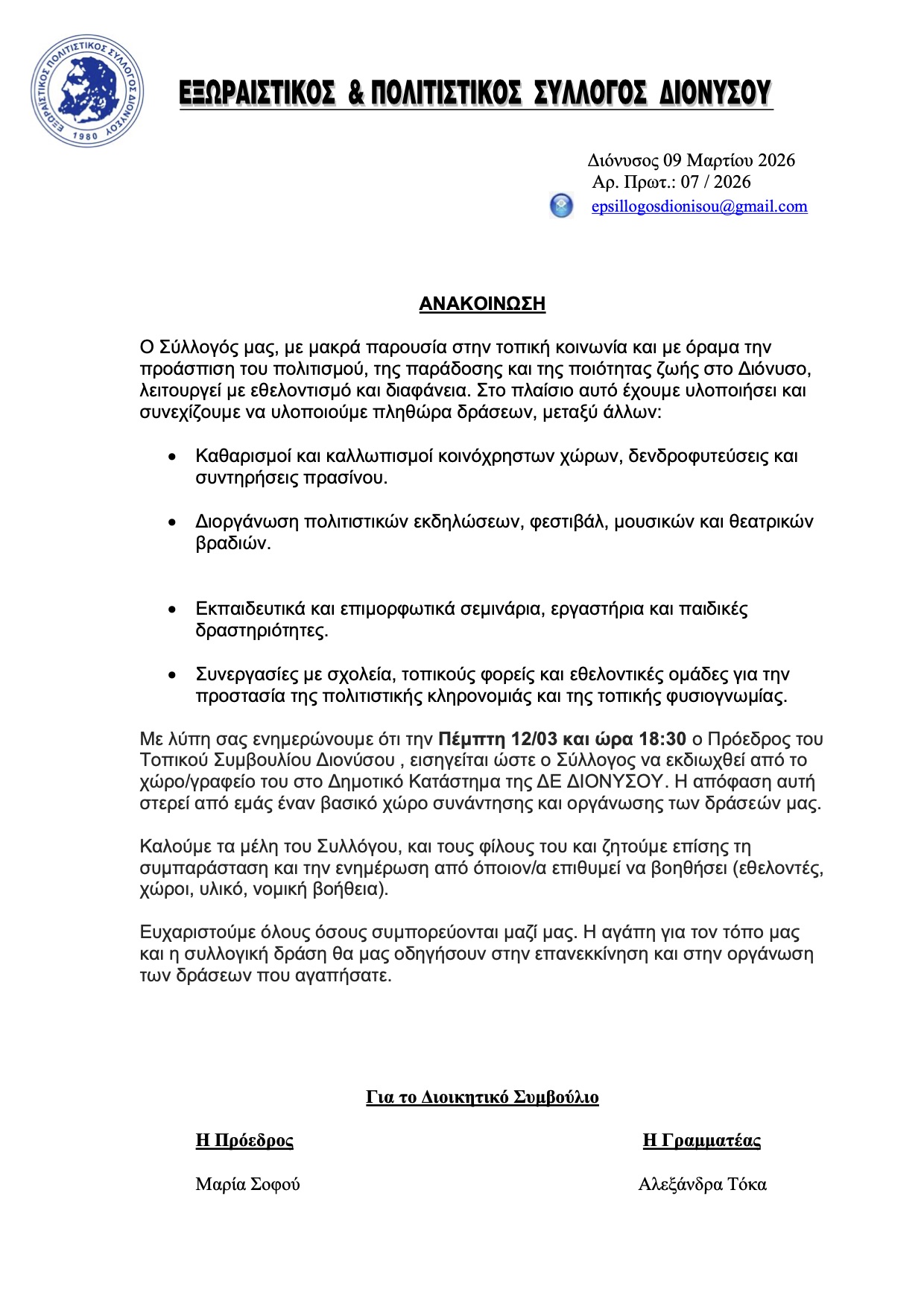 Σε πρόσκληση σε όσους μπορούν να βοηθήσουν προσφέροντας χώρο, υλικό, νομική βοήθεια κ.λπ., προχώρησε ο Εξωραϊστικός και Πολιτιστικός Σύλλογος Διονύσου, ενόψει της συζήτησης στο Τοπικό Συμβούλιο την Πέμπτη 12/3 στις 6.30 το βράδυ, της πρότασης να ανακληθεί η παραχώρηση χρήσης αίθουσας στο κοινοτικό Κατάστημα: