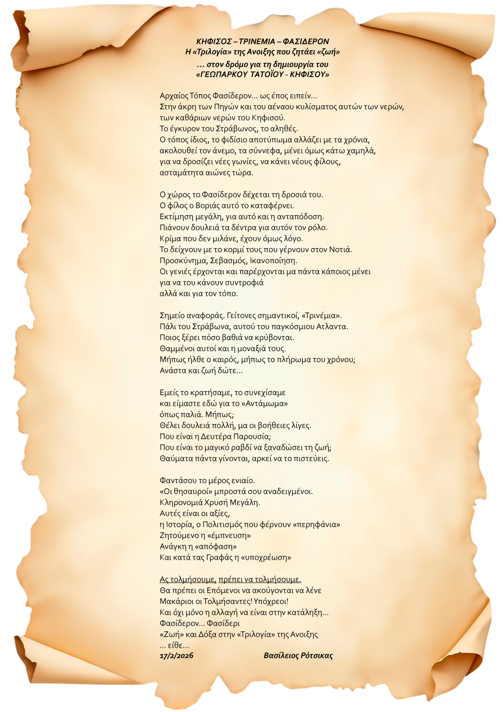 Για τον λόγο αυτό θεωρούμε ότι η πρόταση αυτή αξίζει να εξεταστεί με ιδιαίτερη προσοχή από όλους τους αρμόδιους θεσμούς της Αυτοδιοίκησης και της Πολιτείας. Η ανάδειξη του Κηφισού, των Τρινέμιων και της ιστορικής θέσης Φασίδερον, σε συνδυασμό με το Τατόι, μπορεί να αποτελέσει ένα έργο με ουσιαστική περιβαλλοντική, πολιτιστική και κοινωνική σημασία για ολόκληρη την περιοχή.