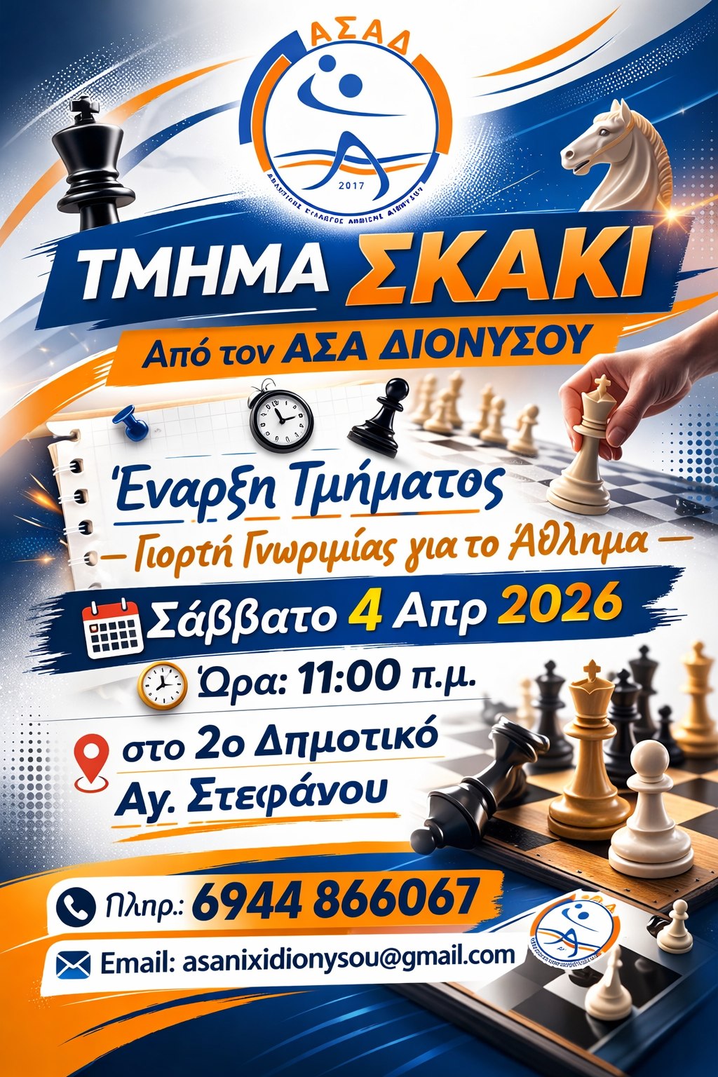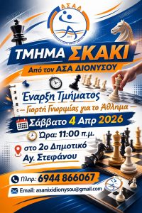 Ο Αθλητικός Σύλλογος Άνοιξης Διονύσου (ΑΣΑΔ) ανοίγει ένα νέο κεφάλαιο στον σύλλογο και ιδρύει Τμήμα Αγωνιστικού Σκακιού, ως μέλος της Ελληνικής Σκακιστικής Ομοσπονδίας.