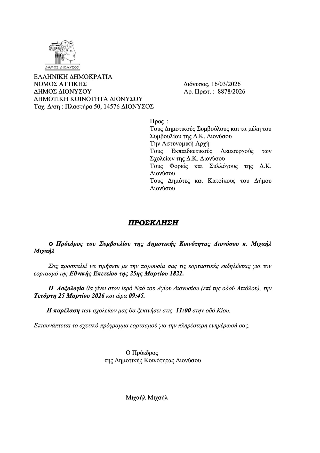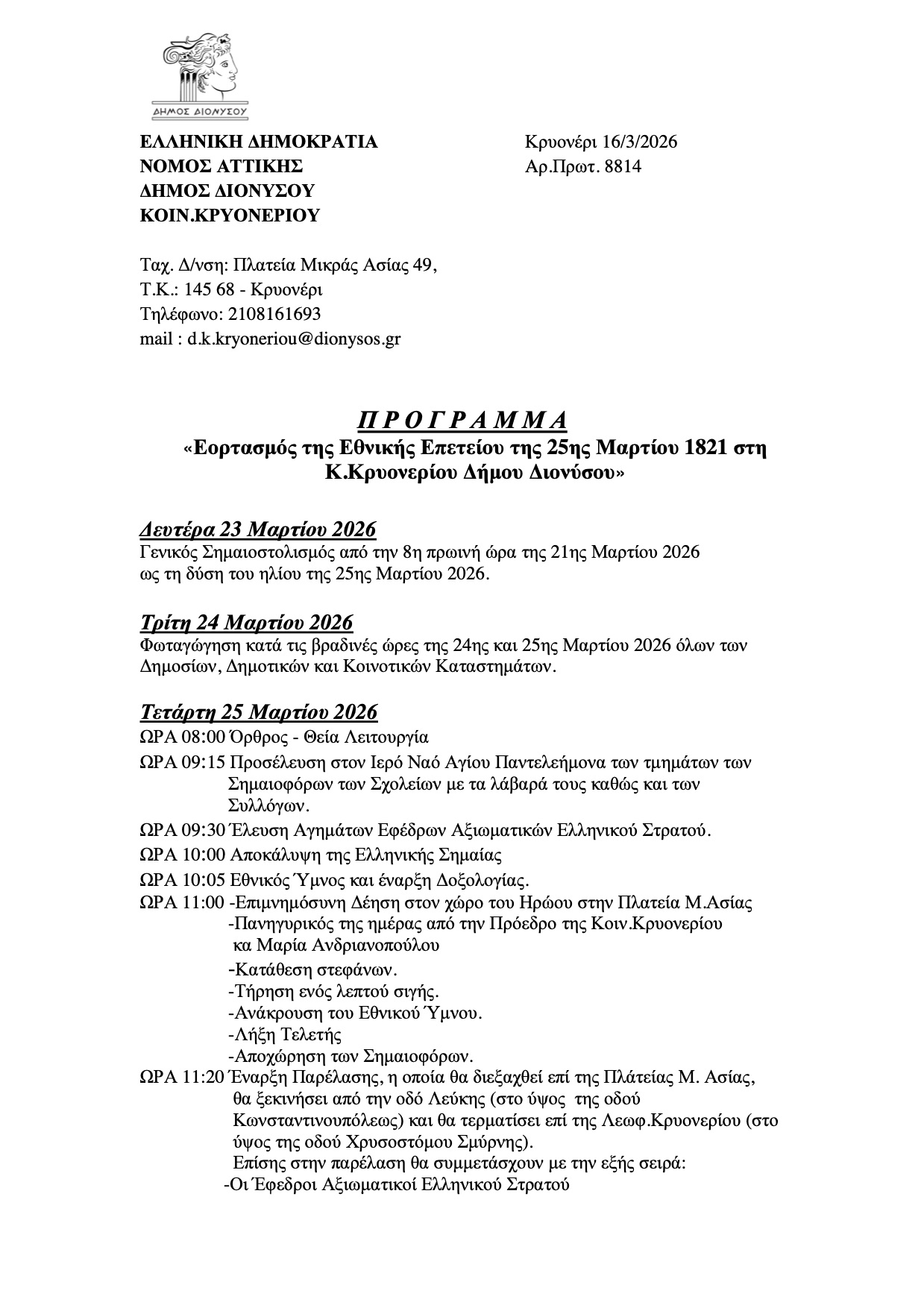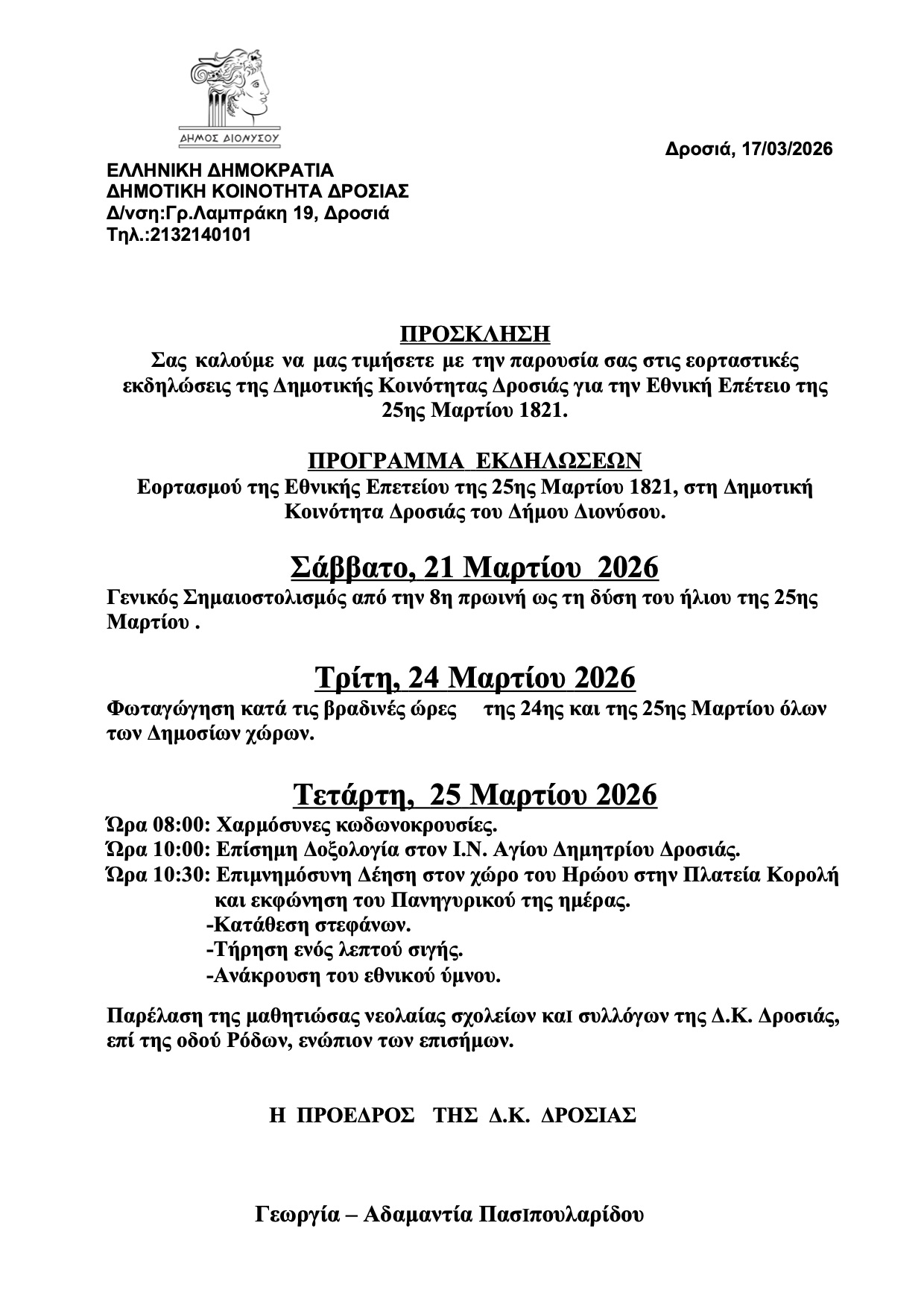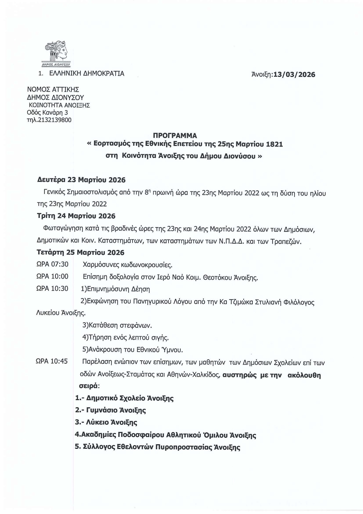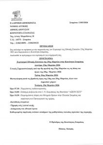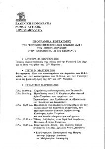 Ο Δήμος Διονύσου τιμά την Εθνική Επέτειο της 25ης Μαρτίου 1821 με εκδηλώσεις σε όλες τις Δημοτικές Κοινότητες, ενισχύοντας το αίσθημα ιστορικής μνήμης και ενότητας.