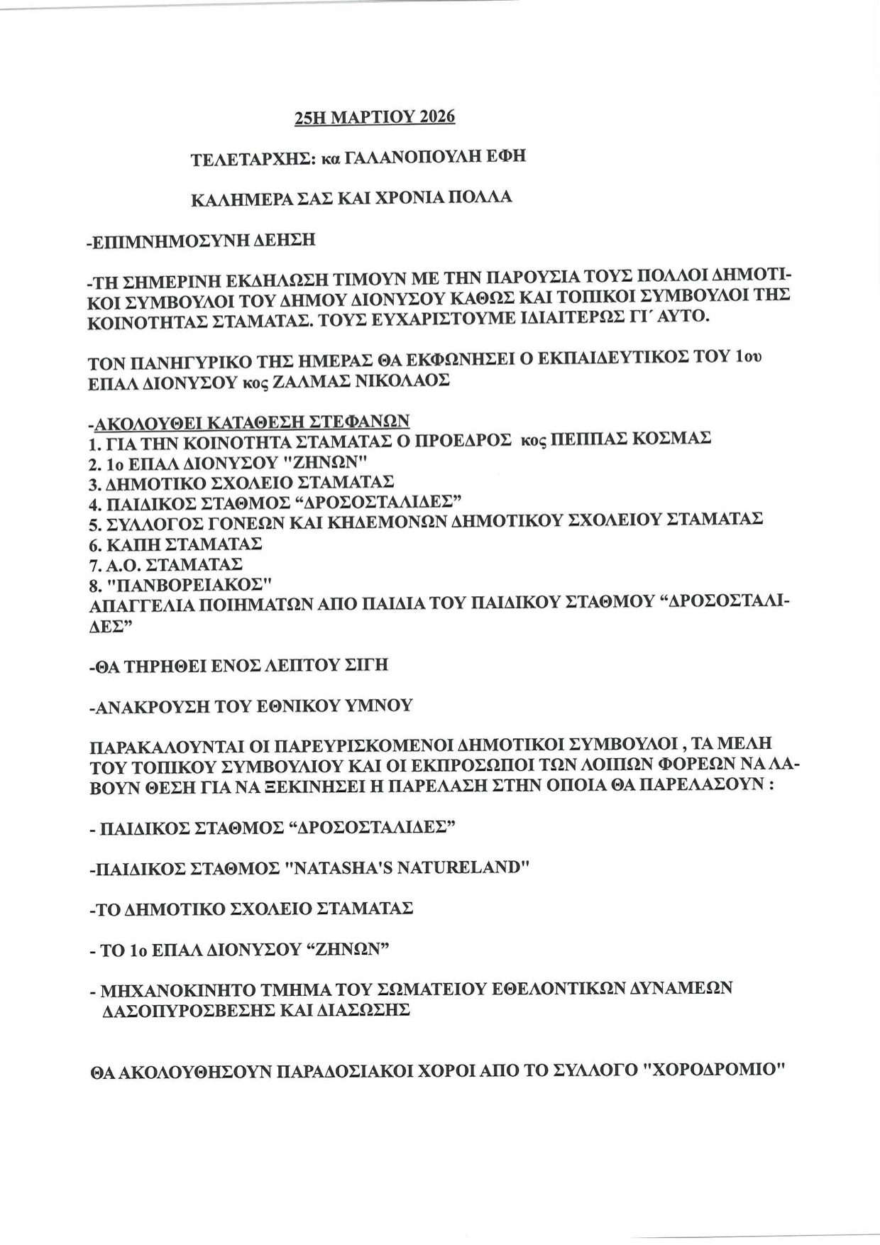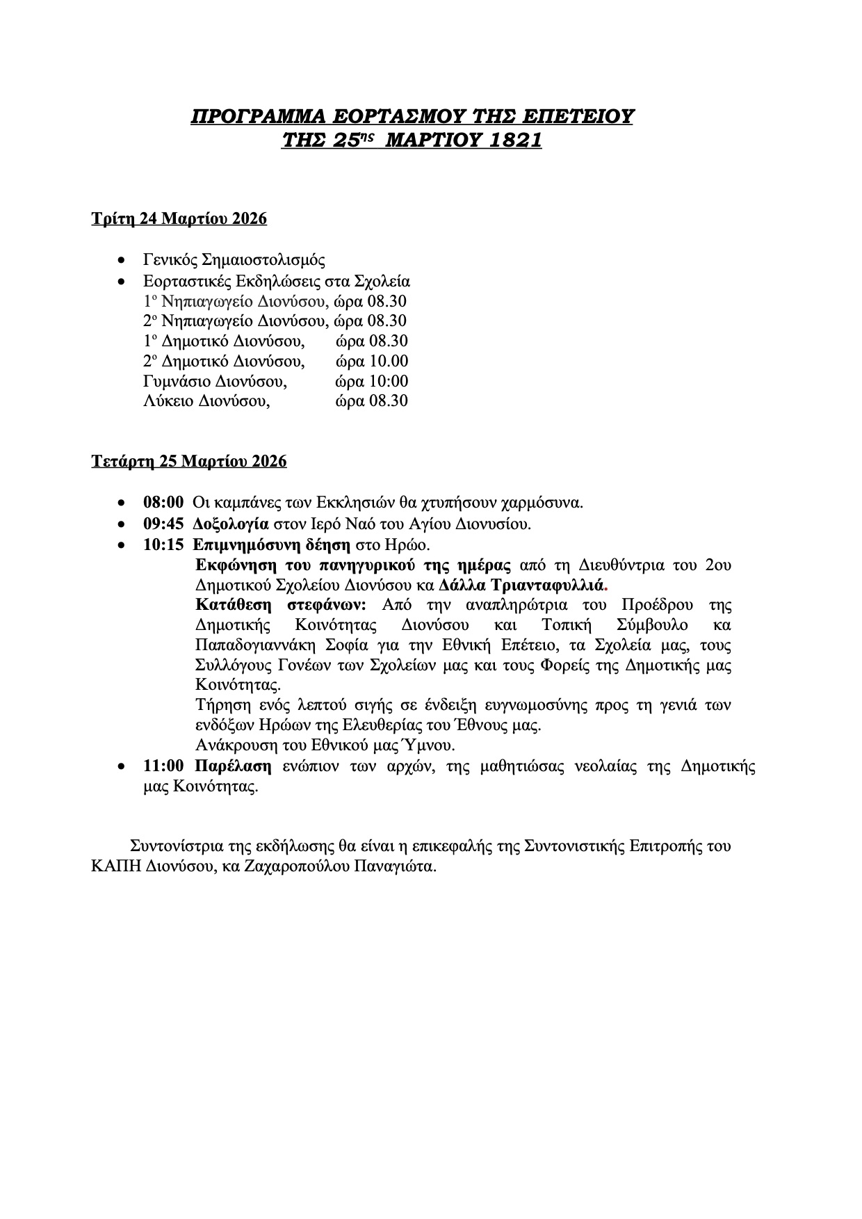 Το πρόγραμμα περιλαμβάνει σημαιοστολισμό και φωταγώγηση των δημόσιων χώρων, επίσημες δοξολογίες στους Ιερούς Ναούς, επιμνημόσυνες δεήσεις και καταθέσεις στεφάνων στα μνημεία των ηρώων, καθώς και μαθητικές παρελάσεις με τη συμμετοχή σχολείων και τοπικών φορέων. Οι εκδηλώσεις θα πραγματοποιηθούν στον Άγιο Στέφανο, τη Δροσιά, τη Ροδόπολη, το Διόνυσο, το Κρυονέρι, τη Σταμάτα και την Άνοιξη, με τη συμμετοχή της μαθητιώσας νεολαίας, συλλόγων και πολιτών.