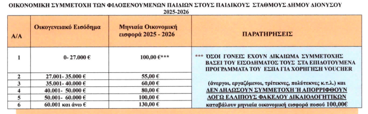 ΘΕΜΑ 12ο: Καθορισμός καταβολής μηνιαίας οικονομικής εισφοράς (τροφεία) για το σχολικό έτος 2026-2027 των φιλοξενούμενων νηπίων στα Παραρτήματα των Παιδικών και Βρεφονηπιακών Σταθμών της Δ/νσης Προσχολικής Αγωγής & Τρίτης Ηλικίας του Δήμου Διονύσου (Δ/νση Προσχολικής Αγωγής, Αρ. Πρωτ. 8431/11-03-26)