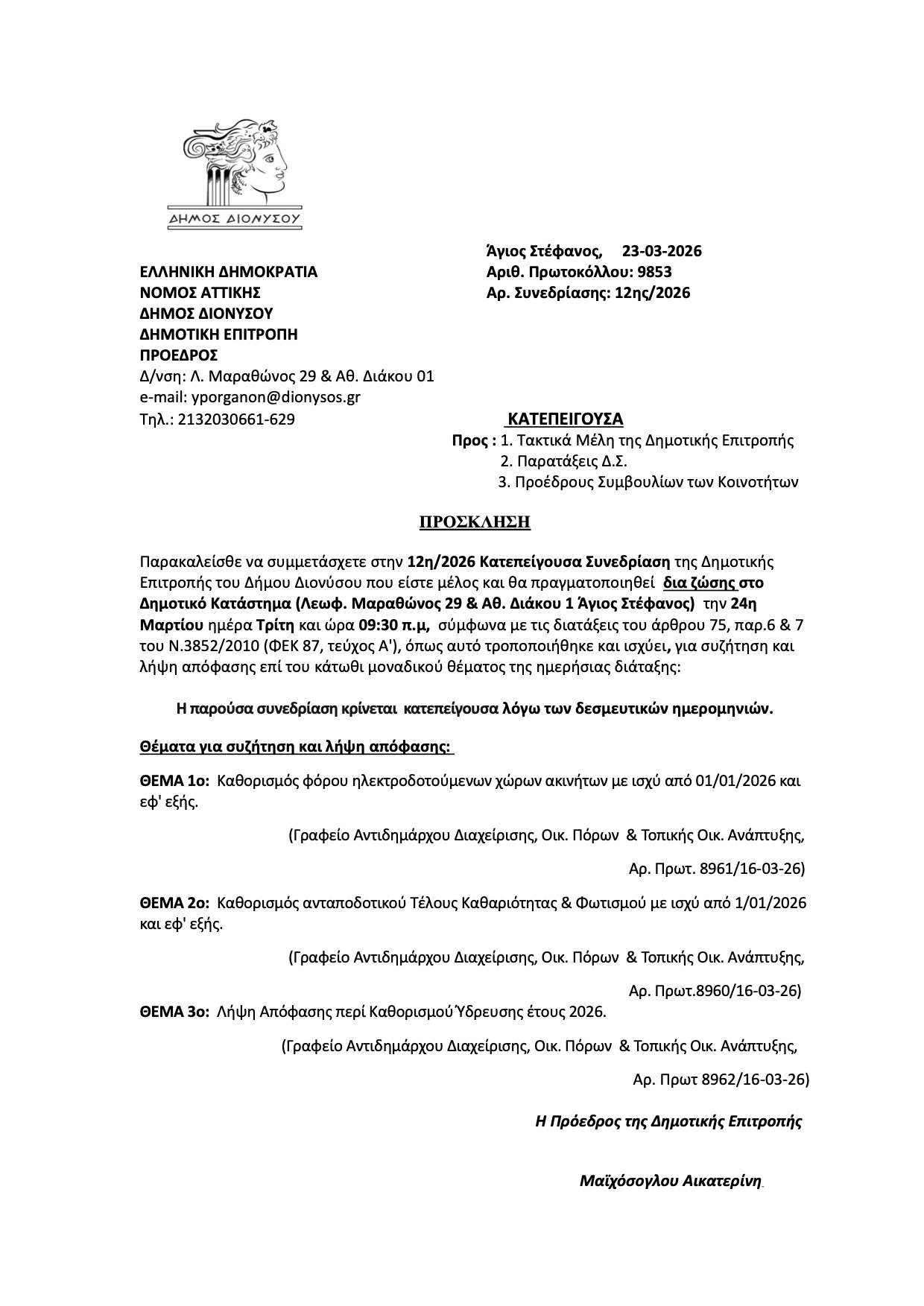 Αύριο, Τρίτη 24 Μαρτίου, στις 9.30 το πρωί θα πραγματοποιηθεί τελικά μόνο δια ζώσης η κατεπείγουσα συνεδρίαση της Δημοτικής Επιτροπής Διονύσου, με την Ημερήσια Διάταξη να αφορά αποκλειστικά στον καθορισμό των τελών και του Φόρου Ηλεκτροδοτούμενων Χώρων (ΦΗΧ) για το 2026, αρχής γενομένης από 1η Ιανουαρίου. Υπενθυμίζεται πως την περασμένη Παρασκευή τα σχετικά θέματα, μετά από πρόταση της Λ. Κανακάρη από την πλειοψηφία, αποσύρθηκαν με στόχο να ξανασυζητηθούν και να αναζητηθούν συναινέσεις, όσον αφορά στο ύψος των προτεινόμενων αυξήσεων, εξασφαλίζοντας την ανταποδοτικότητα αλλά και μη επιβαρύνοντας υπέρμετρα τον πολίτη: