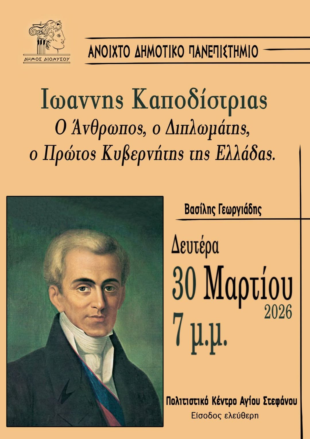 Σήμερα Δευτέρα 30 Μαρτίου στις 7 το βράδυ, στο Πολιτιστικό Κέντρο Αγ. Στεφάνου, και στο πλαίσιο του Ανοιχτού Δημοτικού Πανεπιστημίου, θα πραγματοποιηθεί ομιλία με θέμα “Ιωάννης Καποδίστριας. Ο Άνθρωπος, ο Διπλωμάτης, ο Πρώτος Κυβερνήτης της Ελλάδας”. Ομιλητής ο Β. Γεωργιάδης, ιστορικός και συγγραφέας- μεταξύ άλλων- της μυθιστορηματικής βιογραφίας “Ιωάννης Καποδίστριας. Η συναρπαστική ζωή του φωτισμένου κυβερνήτη”:
