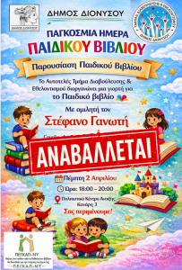 Σας ενημερώνουμε ότι η εκδήλωση για την *Παγκόσμια Ημέρα Παιδικού Βιβλίου* με ομιλητή τον συγγραφέα Στέφανο Γανωτή, που ήταν προγραμματισμένη για την *Πέμπτη 2 Απριλίου*, αναβάλλεται λόγω των έκτακτων έντονων καιρικών φαινομένων. Η νέα ημερομηνία θα ανακοινωθεί σύντομα.