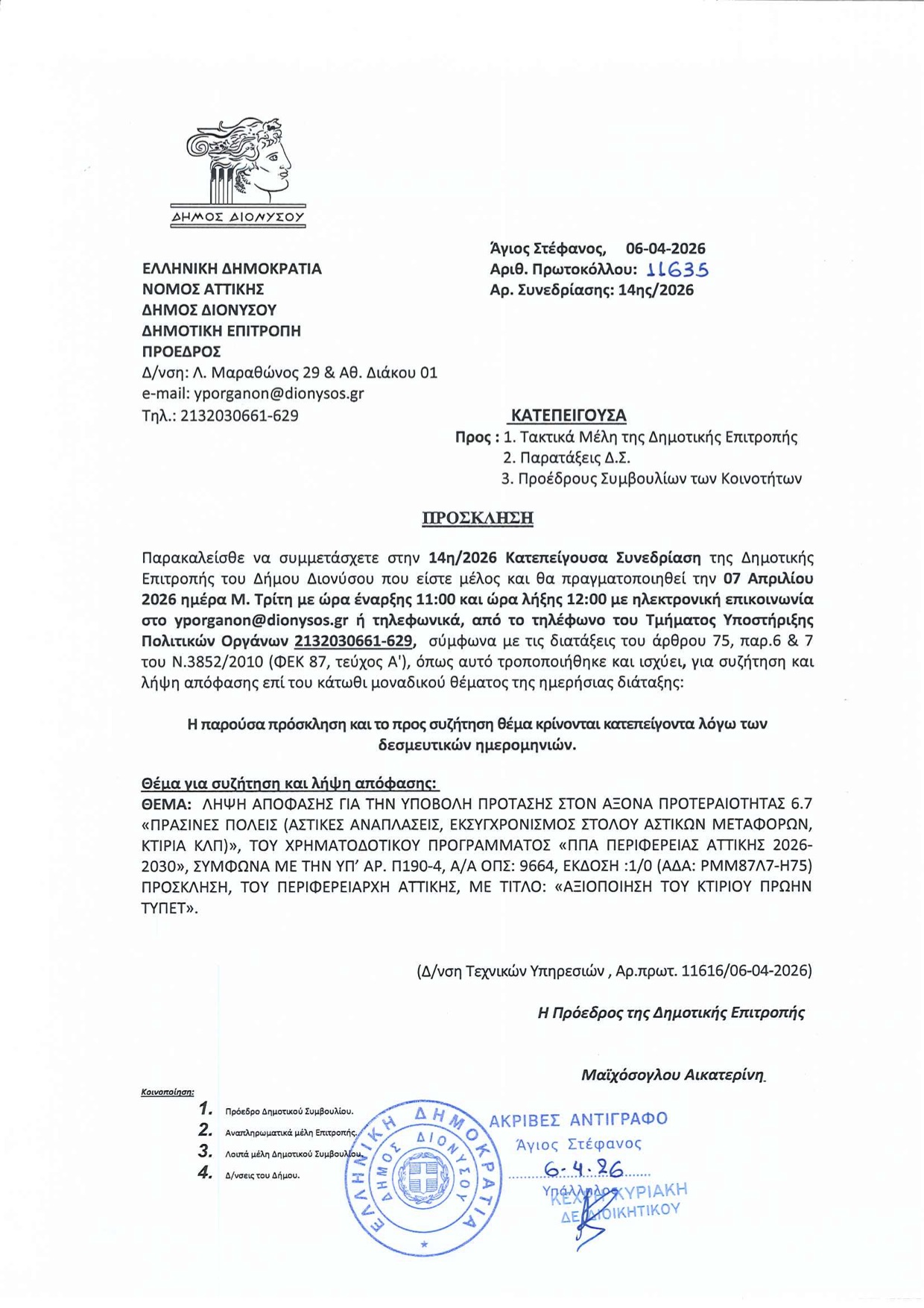 Τηλεφωνικά και δια περιφοράς θα πραγματοποιηθεί σήμερα Μ. Τρίτη 7 Απριλίου στις 11 το πρωί κατεπείγουσα συνεδρίαση της Δημοτικής Επιτροπής Διονύσου, με θέμα την υποβολή πρότασης στο Περιφερειακό Πρόγραμμα Ανάπτυξης 2026-2030, και στον Άξονα Προτεραιότητας “Πράσινες πόλεις (αστικές αναπλάσεις, εκσυγχρονισμός στόλου αστικών μεταφορών, κτίρια κ.λπ.)”, για τη χρηματοδότηση του έργου της αξιοποίησης του ΤΥΠΕΤ Αγ. Στεφάνου με το ποσόν των 3,3 εκατομμυρίων ευρώ.