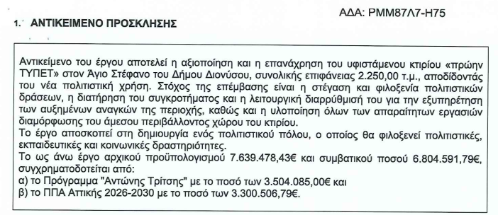 Υπενθυμίζεται πως το έργο αφορά στην αξιοποίηση και επανάχρηση του κτηρίου του ΤΥΠΕΤ, συνολικής επιφάνειας 2.250 τ.μ., ως πολιτιστικό κέντρο. Στόχος της παρέμβασης, τονίζεται στη σχετική πρόσκληση της Περιφέρειας προς το Δήμο Διονύσου, είναι η στέγαση και φιλοξενία πολιτιστικών δράσεων, η διατήρηση του συγκροτήματος και η λειτουργική διαρρύθμισή του για την εξυπηρέτηση των αυξημένων αναγκών της περιοχή, καθώς και η υλοποίηση των απαραίτητων εργασιών διαμόρφωσης του περιβάλλοντα χώρου.