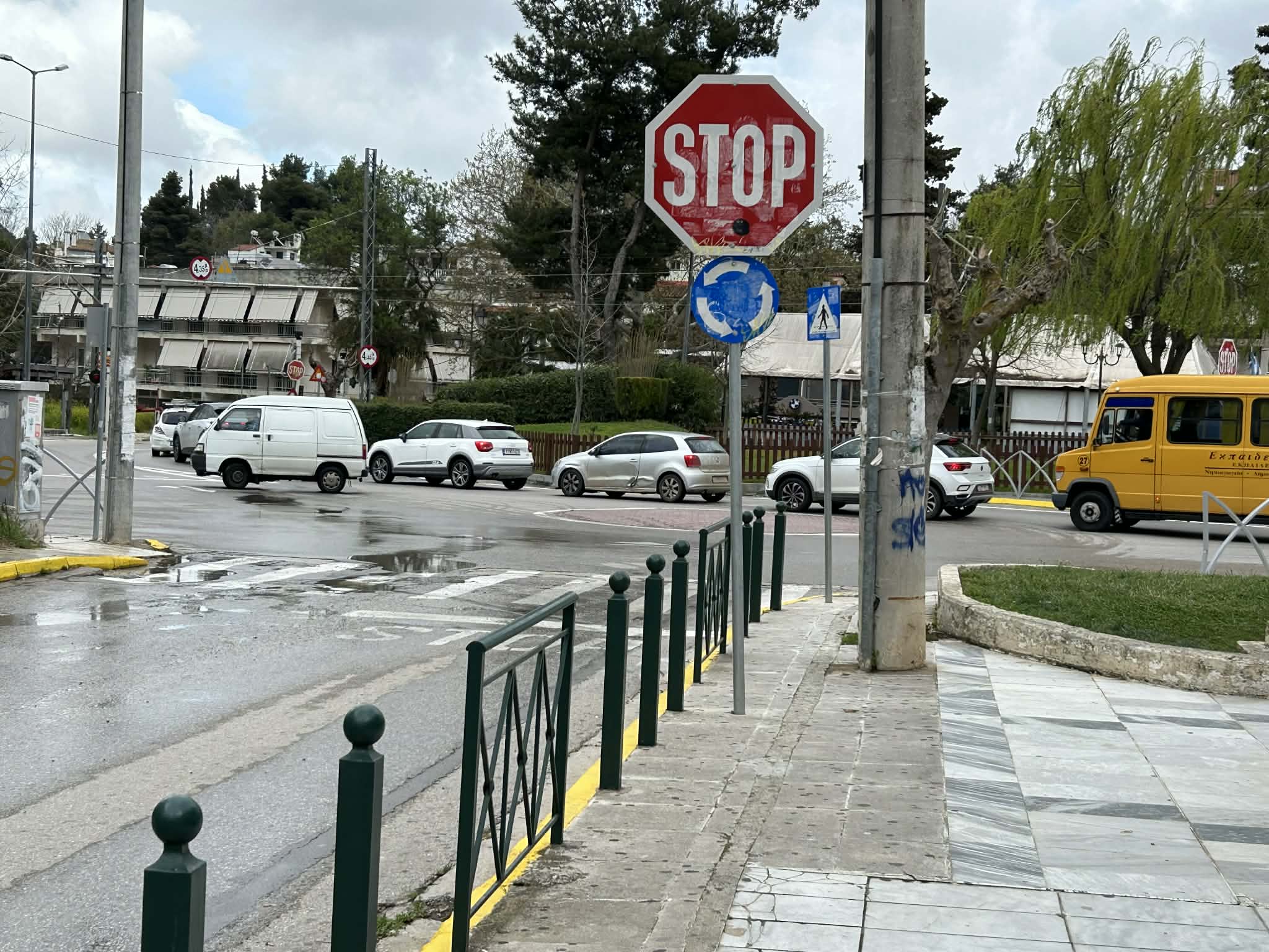 *Και τέλος, ο κίνδυνος που προκαλείται για τους πεζούς- ανάμεσά τους γονείς με παιδιά λόγω των σχολείων- από όσους οδηγούς είτε περνούν πάνω από τον κόμβο είτε παρκάρουν εκεί, μια που είναι ισόπεδος