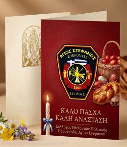 To Διοικητικό Συμβούλιο και τα μέλη του Σύλλογος Εθελοντών Πολιτικής Προστασίας Αγίου Στεφάνου σας εύχονται Καλό Πάσχα και Καλή Ανάσταση με υγεία, αγάπη και ευημερία