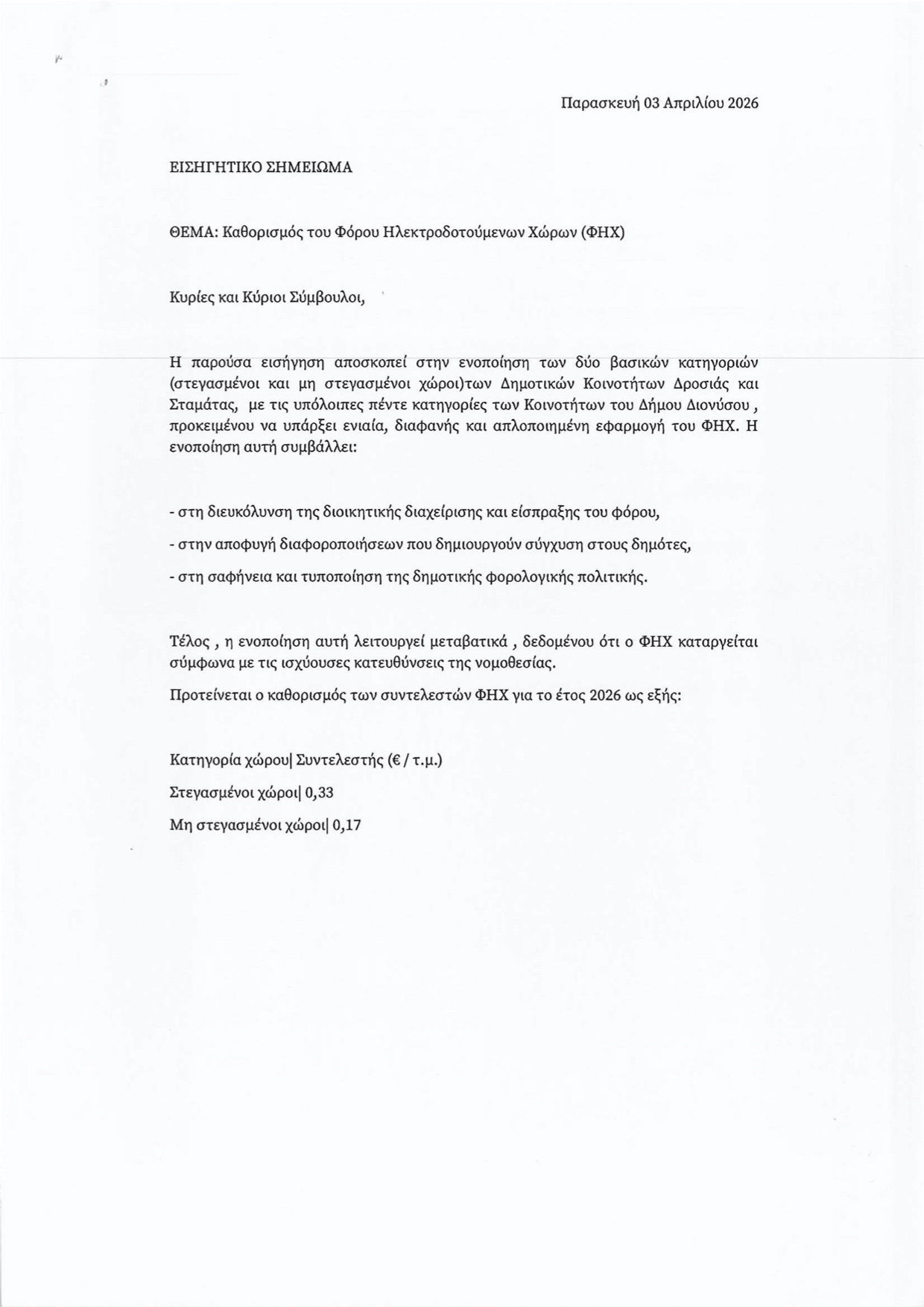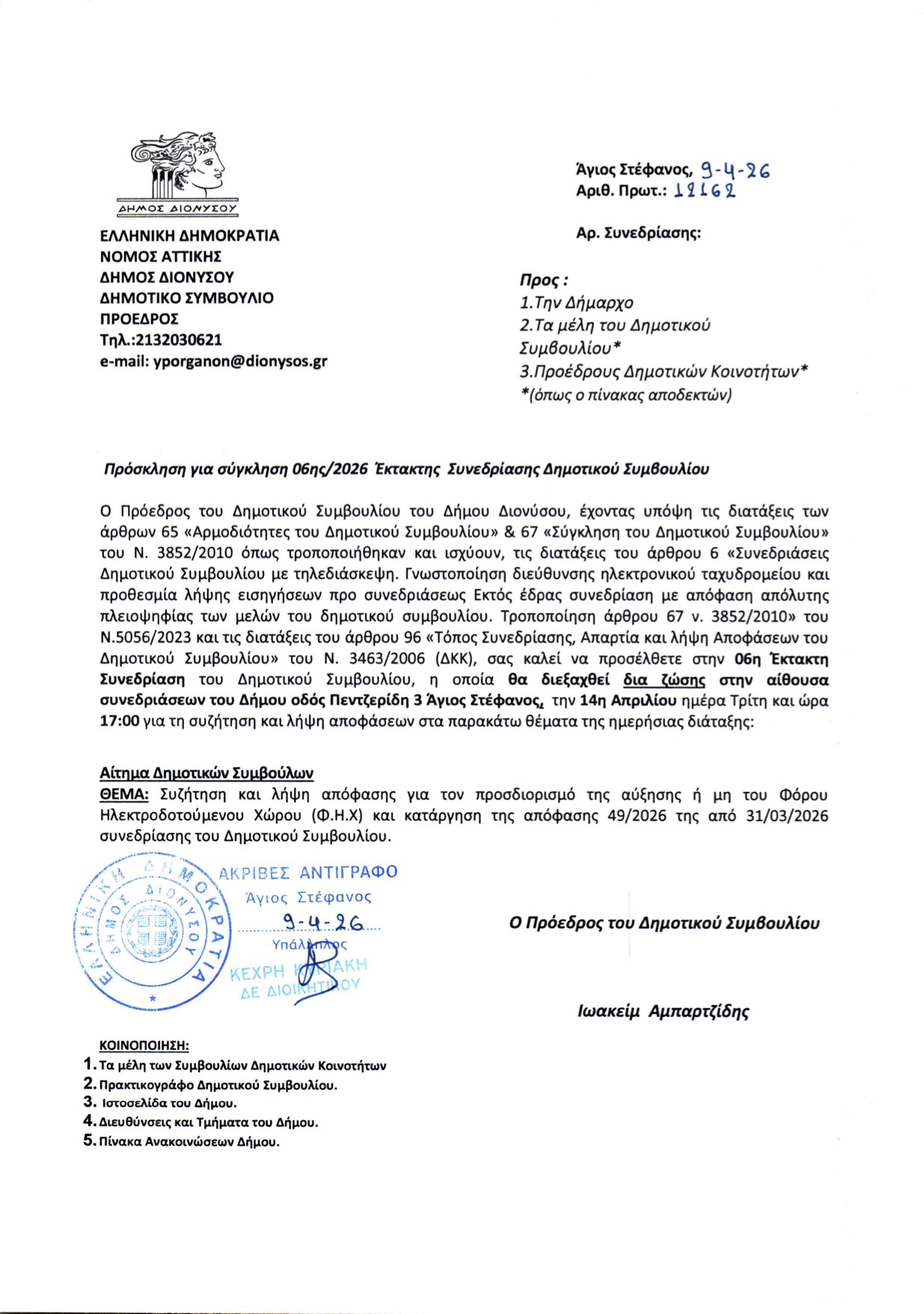 Αύριο Τρίτη του Πάσχα, 14 Απριλίου, και μετά από αίτημα πάνω από 20 δημοτικών συμβούλων με ημερομηνία 3 Απριλίου, θα πραγματοποιηθεί έκτακτη, και μόνο δια ζώσης, συνεδρίαση του Δημοτικού Συμβουλίου Διονύσου, με θέμα τη λήψη νέας απόφασης για την αύξηση στο δημοτικό φόρο (Φόρος Ηλεκτροδοτούμενων Χώρων- ΦΗΧ), με παράλληλη κατάργηση της προηγούμενης αντίστοιχης απόφασης.