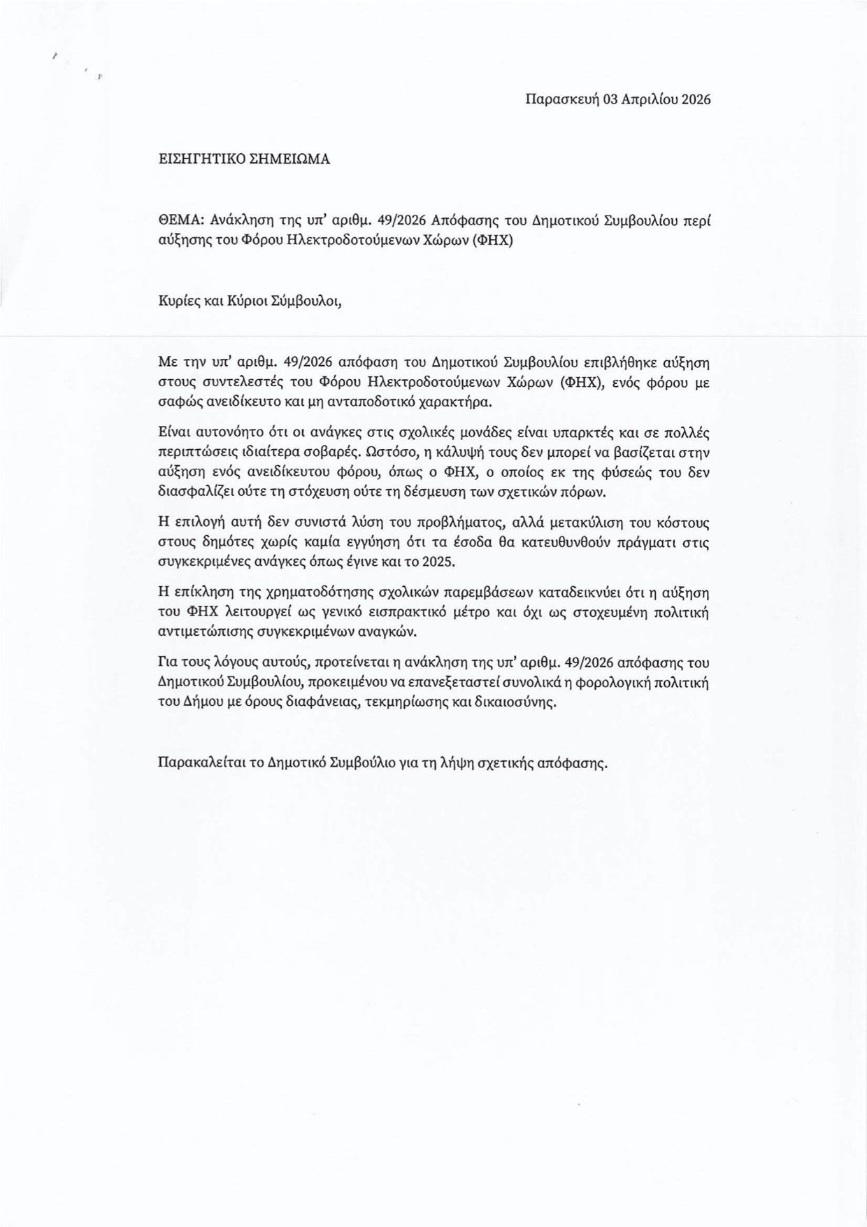 Σημειώνεται εδώ πως ένα μέρος από τα έσοδα του ΦΗΧ μπορούν να κατευθύνονται στις ανάγκες των σχολείων. Η Δημοτική Αρχή, μπροστά στις αντιδράσεις για τη μεγάλη αύξηση, είχε τότε πως πρόθεσή της είναι να διαθέσει στα σχολεία όλο το ποσόν που θα εξοικονομηθεί και που με τη δική της αύξηση ανέρχεται στα 2,3 εκατομμύρια ευρώ, μετατρέποντας ουσιαστικά έναν ανειδίκευτο φόρο σε ανταποδοτικό τέλος, με λειτουργία γενικού εισπρακτικού μέτρου, όπως της καταλογίζουν οι διαφωνούντες σύμβουλοι στο εισηγητικό τους σημείωμα. Οι ίδιοι, επιπλέον, ανέδειξαν και την ολιγωρία της Δημοτικής Αρχής να εισπράξει για το μισό 2025 το φόρο και τα τέλη, που επί μήνες δεν αποτυπώνονταν στους λογαριασμούς της ΔΕΗ, και έτσι αποτελούσαν ένα πλασματικό έσοδο για το Δήμο.