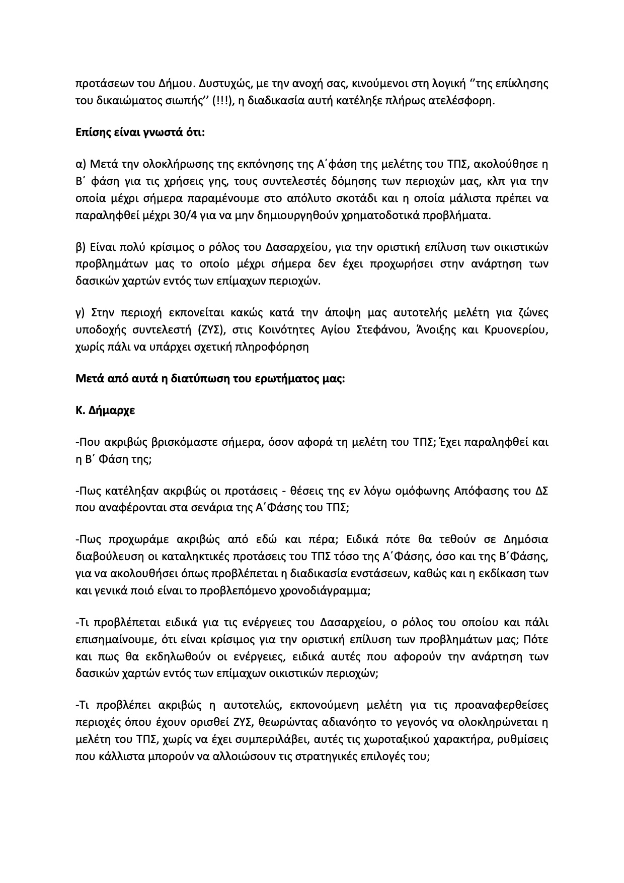 β) Είναι πολύ κρίσιμος ο ρόλος του Δασαρχείου, για την οριστική επίλυση των οικιστικών προβλημάτων μας το οποίο μέχρι σήμερα δεν έχει προχωρήσει στην ανάρτηση των δασικών χαρτών εντός των επίμαχων περιοχών.