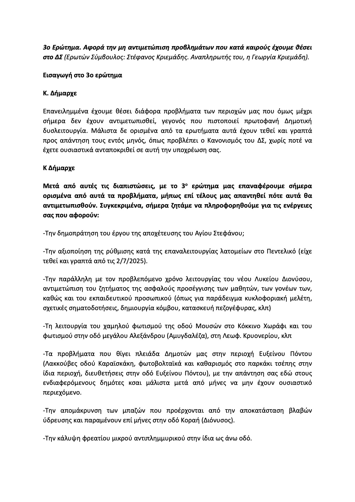 3ο Ερώτημα: Αφορά την μη αντιμετώπιση προβλημάτων που κατά καιρούς έχουμε θέσει στο ΔΣ (Ερωτών Σύμβουλος: Στέφανος Κριεμάδης. Αναπληρωτής του, η Γεωργία Κριεμάδη).