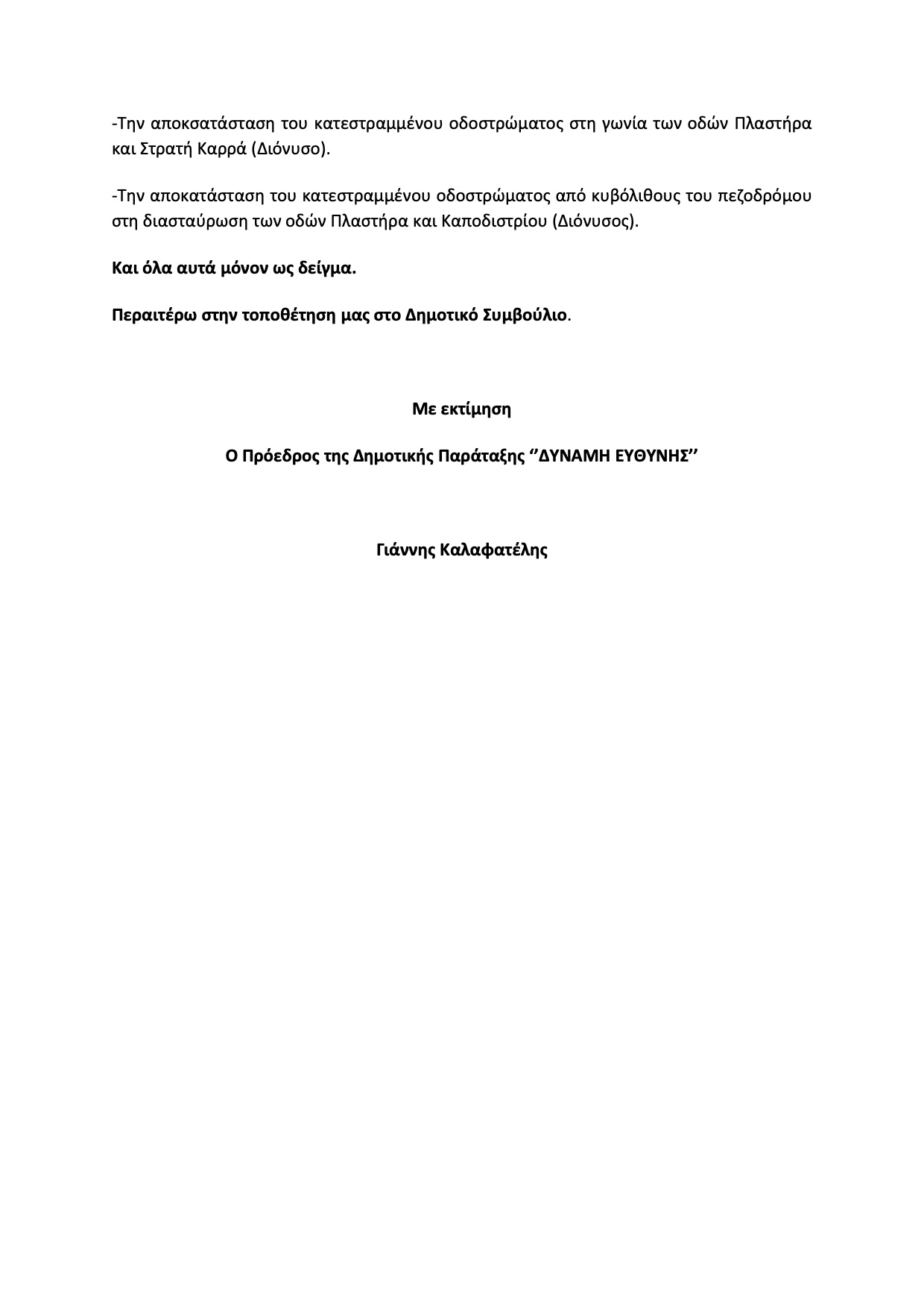 -Την αποκατάσταση του κατεστραμμένου οδοστρώματος από κυβόλιθους του πεζοδρόμου στη διασταύρωση των οδών Πλαστήρα και Καποδιστρίου (Διόνυσος).