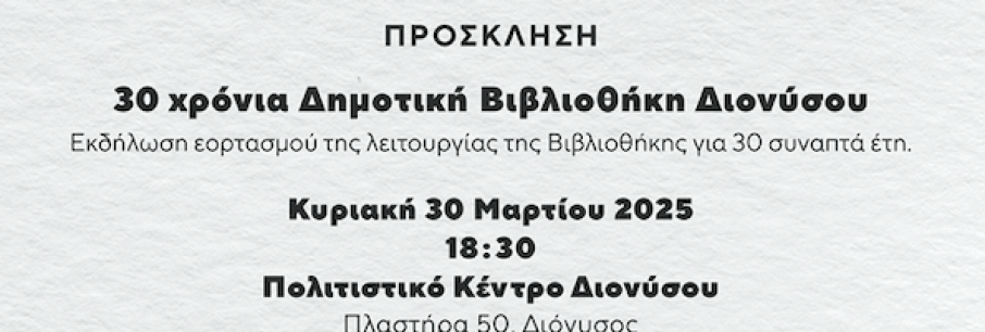 ΠΡΟΣΚΛΗΣΗ Με χαρά σας προσκαλούμε στον εορτασμό των 30 χρόνων λειτουργίας της Δημοτικής Βιβλιοθήκης Διονύσου! Κυριακή 30 Μαρτίου 18:30 Πολιτιστικό Κέντρο Διονύσου Μια ξεχωριστή εκ[...]