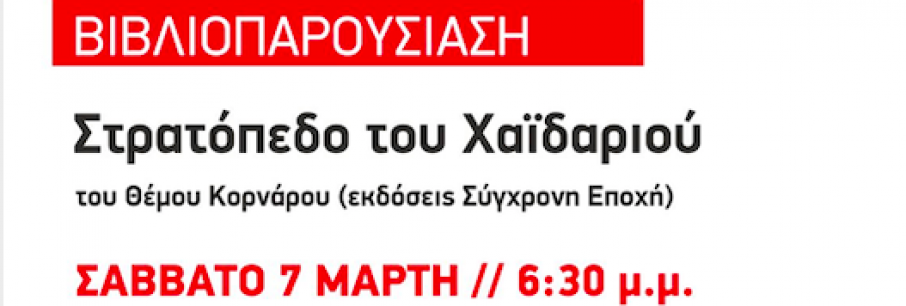 Το βιβλίο του Θέμου Κορνάρου “Το στρατόπεδο του Χαϊδαρίου” από τις εκδόσεις Σύγχρονη Εποχή, θα παρουσιαστεί το Σάββατο 7 Μαρτίου στο Πολιτιστικό Κέντρο Αγ. Στεφάνου στις 6.30 το βρ[...]