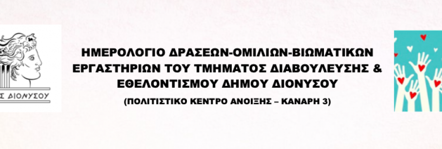 Το πρόγραμμα δράσεων, που το Τμήμα Διαβούλευσης και Εθελοντισμού του Δήμου Διονύσου προγραμματίζει για το μήνα Μάρτιο: Τρίτη 10 Μαρτίου: Ναρκισσισμός και σχέσεις Τρίτη 17 Μαρτίου: [...]