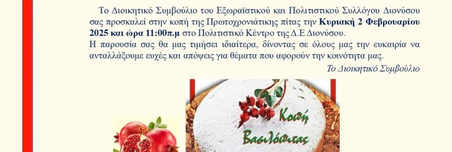ΠΡΟΣΚΛΗΣΗ Με μεγάλη χαρά σάς προσκαλούμε να παρευρεθείτε στην κοπή της πίτας του Συλλόγου μας, στις 2 Φεβρουαρίου 2025, ημέρα Κυριακή και ώρα 11:00 π.μ. στο Πολιτιστικό και Πνευματ[...]