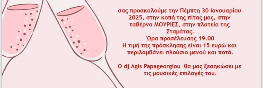 ΠΡΟΣΚΛΗΣΗ Αγαπητά μέλη και φίλοι του ΚΑΠΗ μας, με χαρά σας προσκαλούμε την Πέμπτη 30 Ιανουαρίου 2025, στην κοπή της πίτας μας, που θα πραγματοποιηθεί στην ταβέρνα ΜΟΥΡΙΕΣ, στην πλα[...]