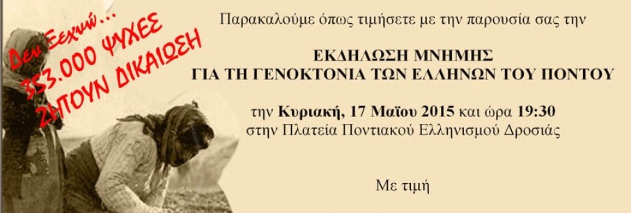 Η Ένωση Ποντίων Δροσιάς σας προσκαλεί να τιμήσετε με την παρουσία σας την εκδήλωση μνήμης για τη Γενοκτονία των Ελλήνων του Πόντου την Κυριακή 17 Μαΐου 2015 και ώρα 19:30 στην πλατ[...]