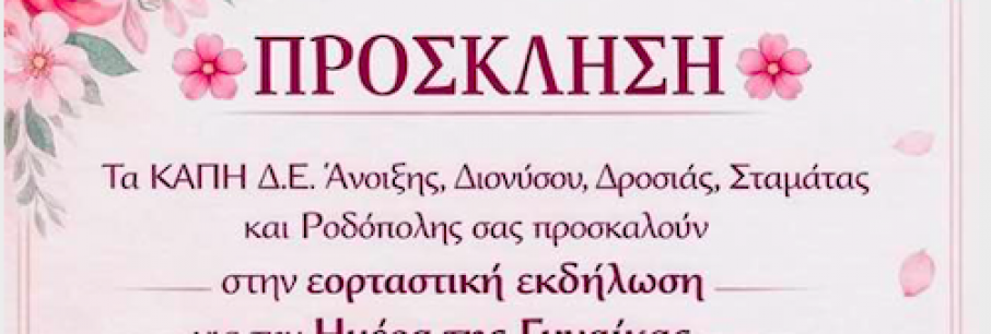 ΠΡΟΣΚΛΗΣΗ Με αφορμή την 8η Μαρτίου – Παγκόσμια Ημέρα της Γυναίκας, τα πέντε ΚΑΠΗ του Δήμου μας – ΚΑΠΗ Άνοιξης, ΚΑΠΗ Διονύσου, ΚΑΠΗ Δροσιάς, ΚΑΠΗ Σταμάτας ΚΑΠΗ Ροδόπολης – ενώνουμε [...]
