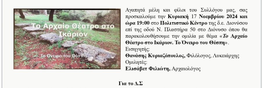 Την Κυριακή 17 Νοεμβρίου, στις 7 το βράδυ, ο Εξωραϊστικός και Πολιτιστικός Σύλλογος Διονύσου οργανώνει εκδήλωση-ομιλία για το αρχαίο θέατρο στην πόλη μας, με τίτλο “Το Αρχαίο Θέατρ[...]