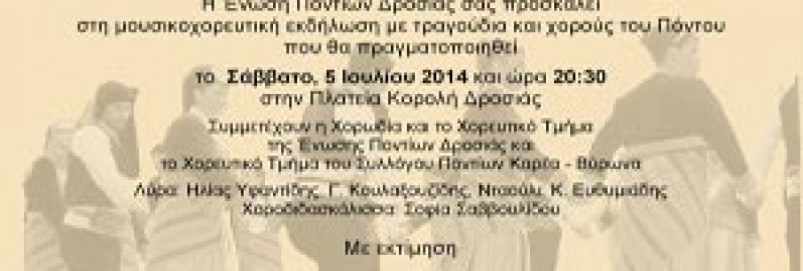 Η Ένωση Ποντίων Δροσιάς σας προσκαλεί στη μουσικοχορευτική εκδήλωση με τραγούδια και χορούς του Πόντου που θα πραγματοποιηθεί το Σάββατο, 5 Ιουλίου 2014 και ώρα 20:30, στην Πλατεία[...]