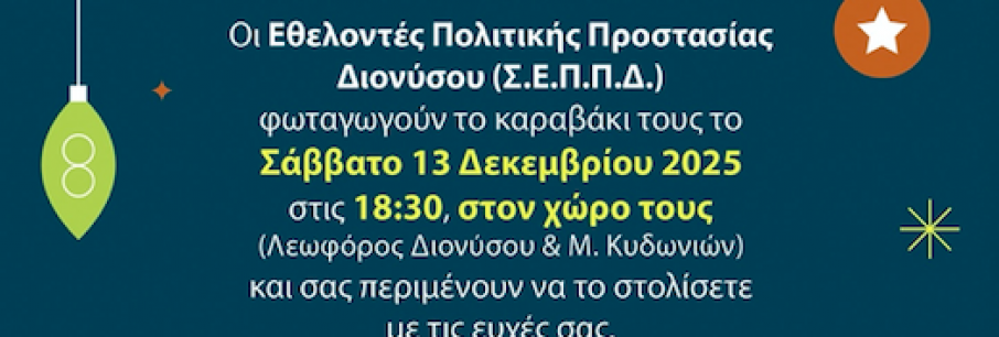Ζεστό κρασί, σνακ και γλυκά θα περιμένουν όσους προσέλθουν στο χώρο των Εθελοντών Πολιτικής Προστασίας Διονύσου (Λ. Διονύσου και Μητρ. Κυδωνιών) για να ανάψουν μαζί το χριστουγενν[...]