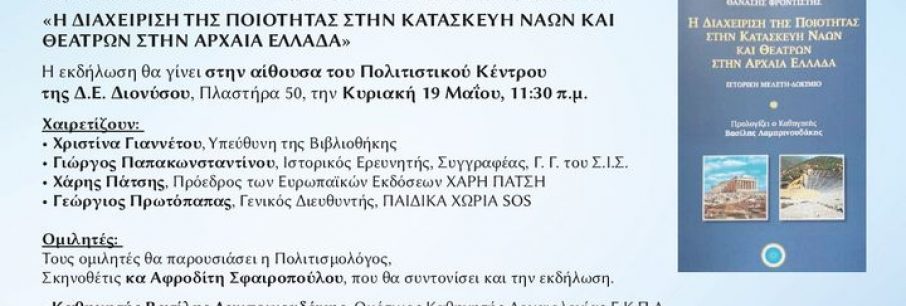 Ακόμη μια παρουσίαση βιβλίου από παλιό συμπολίτη θα πραγματοποιηθεί στο Πολιτιστικό Κέντρο της Κοινότητας Διονύσου, την Κυριακή 19 Μαΐου στις 11.30 το πρωί. Πρόκειται για την ιστορ[...]
