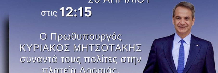 Ο Πρωθυπουργός και Πρόεδρος της Νέας Δημοκρατίας Κυριάκος Μητσοτάκης θα συναντήσει τους πολίτες στην πλατεία Δροσιάς την Παρασκευή 26 Απριλίου 2024 στις 12:15 το μεσημέρι στο καφέ [...]