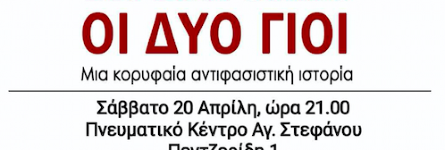 Η θεατρική παράσταση “Οι δυο γιοι” του Μπέρτολτ Μπρεχτ, από τη θεατρική ομάδα 2150 του Α. Ζαφείρη, ανεβαίνει στο Πολιτιστικό Κέντρο του Αγ. Στεφάνου, μεθαύριο Σάββατο 20 Απριλίου σ[...]