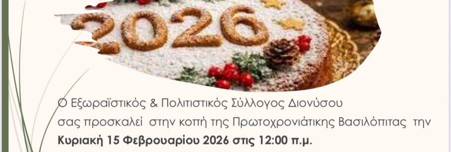 ΠΡΟΣΚΛΗΣΗ Ο Εξωραϊστικός και Πολιτιστικός Σύλλογος Διονύσου, προσκαλεί τα μέλη και τους φίλους του στην κοπή της Πρωτοχρονιάτικης Πίτας Κυριακή 15 Φεβρουαρίου 2026 Ώρα 12:00 π.μ. [...]