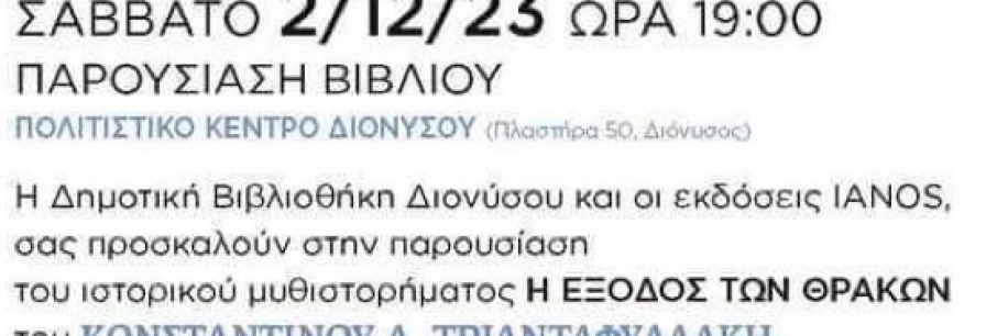 Η Δημοτική Βιβλιοθήκη και οι εκδόσεις Ιανός θα παρουσιάσουν το ιστορικό μυθιστόρημα του Κ. Α. Τριανταφυλλάκη «Η Έξοδος των Θρακών” το Σάββατο 2 Δεκεμβρίου στις 7 το βράδυ στο Πολιτ[...]