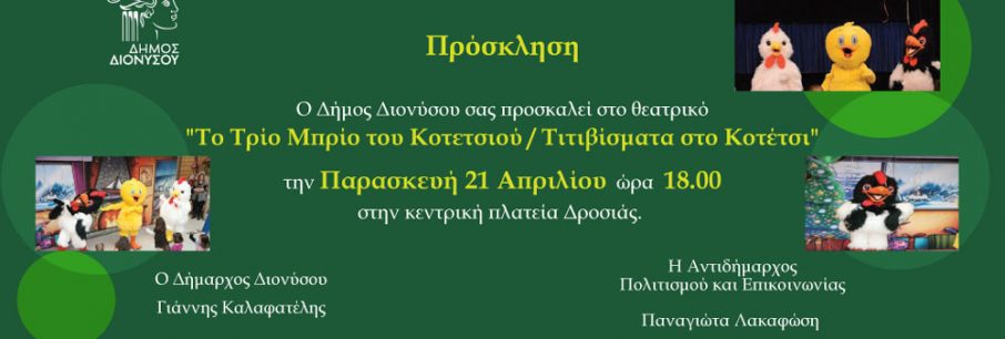 Η παιδική θεατρική παράσταση “Το τρίο μπρίο του κοτετσιού/Τιτιβίσματα στο κοτέτσι” θα παρουσιαστεί αύριο Παρασκευή 21 Απριλίου στις 6 το απόγευμα στην κεντρική πλατεία της Δροσιάς.[...]