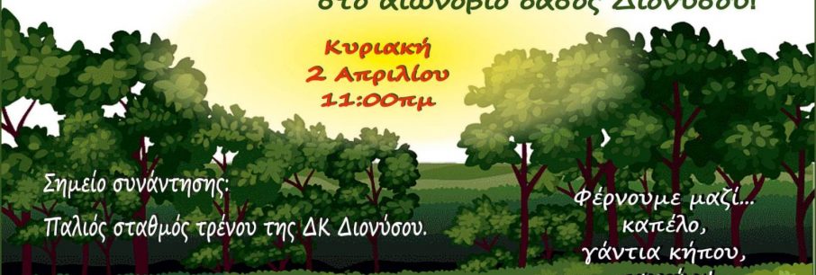Εθελοντική δράση καθαρισμού του αιωνόβιου δάσους Διονύσου διοργανώνουν όλοι οι Σύλλογοι Γονέων & Κηδεμόνων της Κοινότητας Διονύσου (Νηπιαγωγεία, Δημοτικά, Γυμνάσιο, Λύκειο). Η [...]