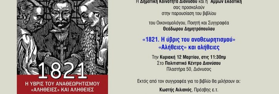 Στις 11.30 σήμερα το πρωί θα παρουσιαστεί στο Πολιτιστικό Κέντρο της Κοινότητας Διονύσου το βιβλίο του οικονομολόγου, ποιητή και συγγραφέα Θ. Δημητρόπουλου «1821. Η ύβρις του αναθε[...]