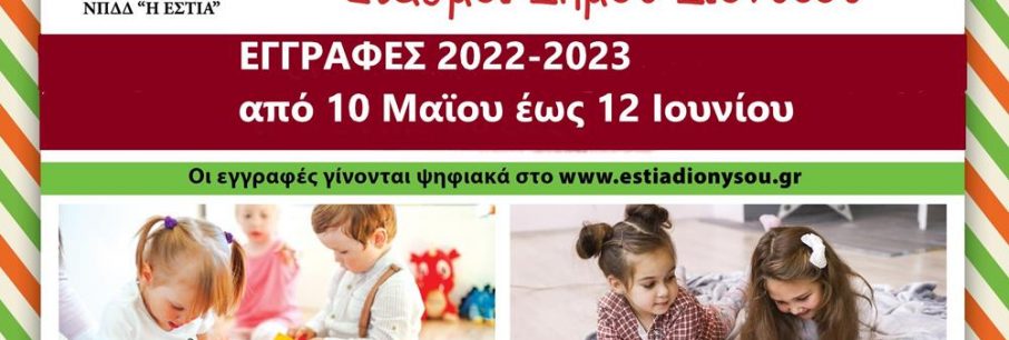 ΑΝΑΚΟΙΝΩΣΗ Με χαρά ενημερώνουμε τους γονείς ότι ξεκινούν οι εγγραφές των νηπίων και βρεφών στους Παιδικούς και Βρεφονηπιακούς σταθμούς του Ν.Π.Δ.Δ ΚΟΙΠΑΠ «Η ΕΣΤΙΑ» του Δήμου Διονύσ[...]