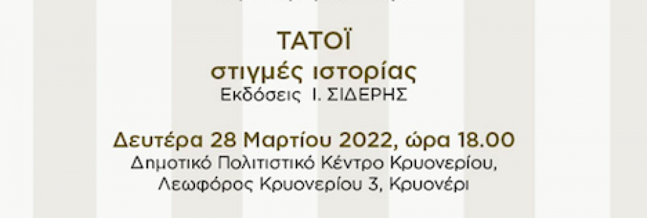 ΠΡΟΣΚΛΗΣΗ Ο Δήμος Διονύσου σας προσκαλεί στην παρουσίαση του βιβλίου της γνωστής δημοσιογράφου Αλεξίας Κουλούρη με τίτλο «ΤΑΤΟΪ στιγμές ιστορίας» από τις Εκδόσεις Ι. ΣΙΔΕΡΗΣ. Η εκδ[...]