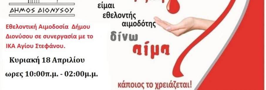 O Δήμος Διονύσου, συνεχίζει το πρόγραμμα αιμοδοσιών στην προσπάθεια στήριξης του Εθνικού Συστήματος Υγείας. Η επόμενη Εθελοντική Αιμοδοσία θα πραγματοποιηθεί την Κυριακή 18 Απριλίο[...]
