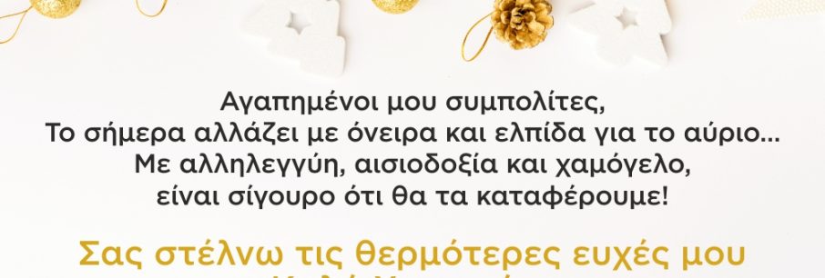 Το σήμερα αλλάζει με όνειρα και ελπίδα για το αύριο… Με αλληλεγγύη, αισιοδοξία και χαμόγελο, είναι σίγουρο ότι θα τα καταφέρουμε ! Σας στέλνω τις θερμότερες ευχές μου για Καλά Χρισ[...]