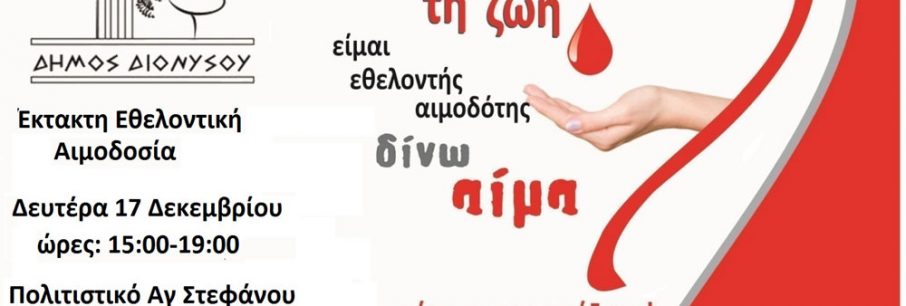 ΑΝΑΚΟΙΝΩΣΗ O Δήμος Διονύσου διοργανώνει Έκτακτη Εθελοντική Αιμοδοσία την Πέμπτη 17 Δεκεμβρίου 2020 ώρες 15:00 μ.μ. – 19:00 μ.μ. στο Πολιτιστικό Κέντρο Αγίου Στεφάνου, στην οδ[...]