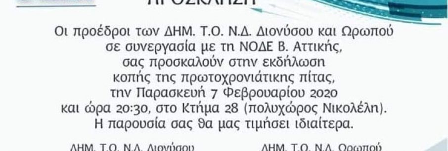 Την Πέμπτη 6 Φεβρουαρίου στις 8.30 το βράδυ θα κόψει την πίτα του το ΚΑΠΗ Διονύσου. Υπενθυμίζεται πως η εκδήλωση ήταν προγραμματισμένη για τις 30 Ιανουαρίου αλλά είχε αναβληθεί λόγ[...]