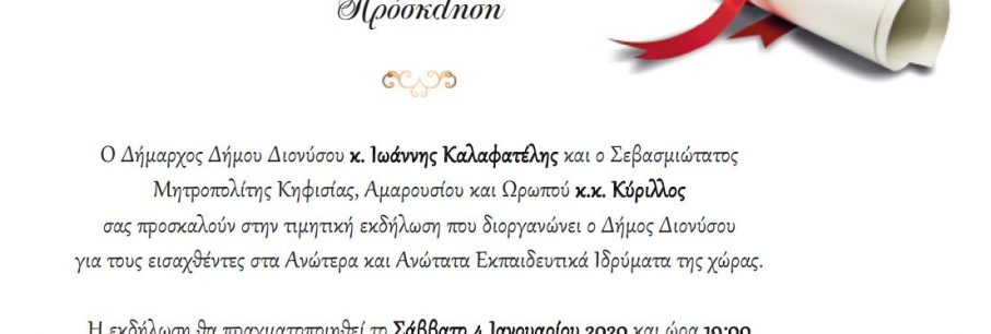 ΠΡΟΣΚΛΗΣΗ Ο Δήμος Διονύσου διοργανώνει και προσκαλεί όλους τους δημότες στην Τελετή Βράβευσης των μαθητών του Δήμου που εισήχθησαν στην Τριτοβάθμια Εκπαίδευση, για το ακαδημαϊκό έτ[...]