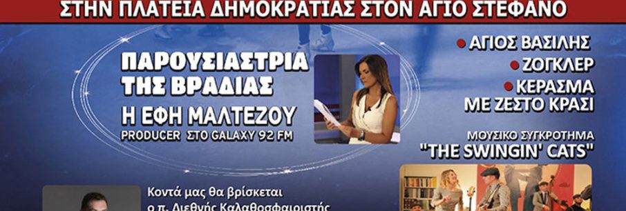 Αύριο Παρασκευή 20 Δεκεμβρίου στις 6 το βράδυ ο Δήμος Διονύσου θα ανάψει το Χριστουγεννιάτικο δέντρο στην πλατεία Δημοκρατίας στον Άγ. Στέφανο. Το άναμμα του δέντρου θα πλαισιώνει [...]