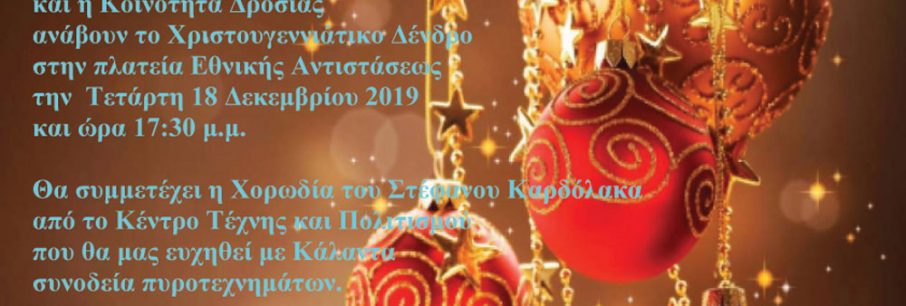 Την Τετάρτη 18 Δεκεμβρίου στις 5.30 το απόγευμα ο Εμπορικός Σύλλογος Διονύσου και η Κοινότητα Δροσιάς θα ανάψουν το Χριστουγεννιάτικο δέντρο στην πλατεία Εθνικής Αντίστασης, με τη [...]