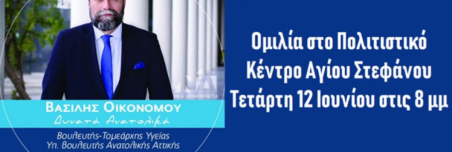 Στο Πολιτιστικό Κέντρο Αγ. Στεφάνου, αύριο Τετάρτη 12 Ιουνίου, στις 8 το βράδυ, θα μιλήσει ο Β. Οικονόμου, βουλευτής, Τομεάρχης Υγείας της Ν.Δ. και υποψήφιος βουλευτής Αν. Αττικής:[...]