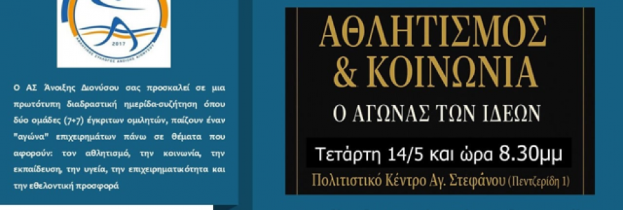 ΔΕΛΤΙΟ ΤΥΠΟΥ Ο Αθλητικός Σύλλογος Άνοιξης Διονύσου (ΑΣΑΔ) διοργανώνει την καινοτόμα ημερίδα – συζήτηση με τίτλο: «ΑΘΛΗΤΙΣΜΟΣ & ΚΟΙΝΩΝΙΑ: Ο Αγώνας των Ιδεών» Μια ξεχωριστή και π[...]